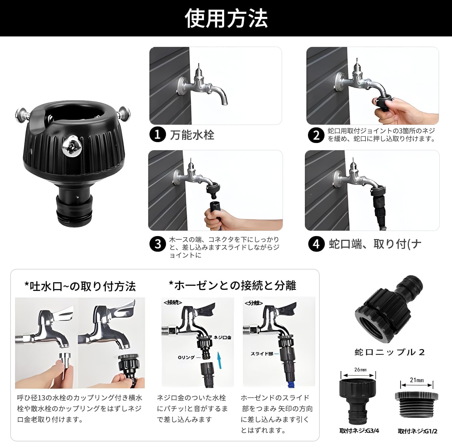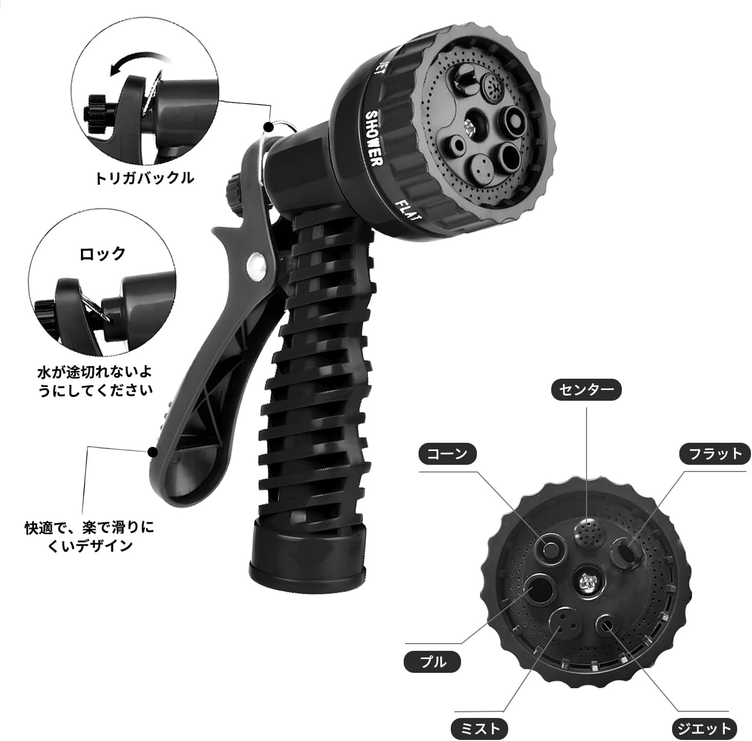- 7 Spray Patterns Nozzle: Comes with a multi-spray nozzle that can produce 7 different water shapes. Comes with a lever that allows you to adjust the amount of water and change the shape of the water by twisting the tip of the nozzle, making it convenient to use for a variety of purposes